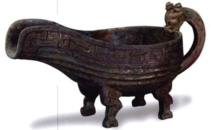 □□匜”(只是拍攝角度略有不同)。此器流槽較長(zhǎng)且略上昂,龍首形扳,口沿飾獸目交連紋,腹壁飾數(shù)道橫條溝紋,獸蹄形扁足。從形制和紋飾上看,時(shí)代應(yīng)屬于西周末期至春秋早期。