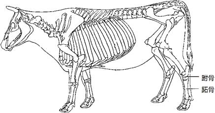 據(jù)家畜解剖學(xué)知識(shí),家畜的后肢骨有一部分稱之為“跗骨”(Ossatarsi),由數(shù)塊短骨構(gòu)成,位于小腿骨與跖骨之間。各種家畜數(shù)目不同,一般分為3列。近列有2塊,內(nèi)側(cè)的為脛跗骨,又稱距骨(Talus);外側(cè)的為腓跗骨,又稱跟骨(Calcaneus)。牛的跗骨有5塊,近列為距骨和跟骨(圖四)。