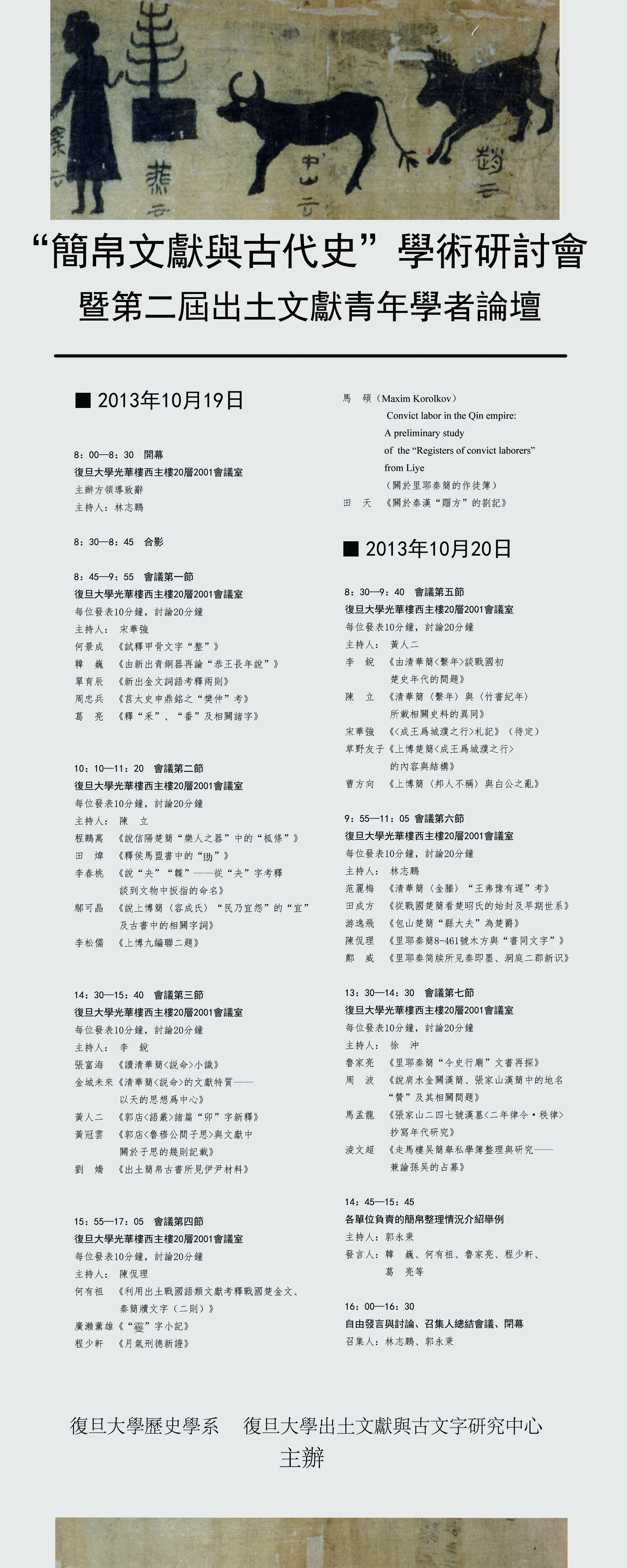 復(fù)旦大學(xué)歷史學(xué)系、復(fù)旦大學(xué)出土文獻(xiàn)與古文字研究中心主辦的“簡(jiǎn)帛文獻(xiàn)與古代史”學(xué)術(shù)研討會(huì)暨第二屆出土文獻(xiàn)青年學(xué)者論壇將於2013年10月19-20日在復(fù)旦大學(xué)召開。