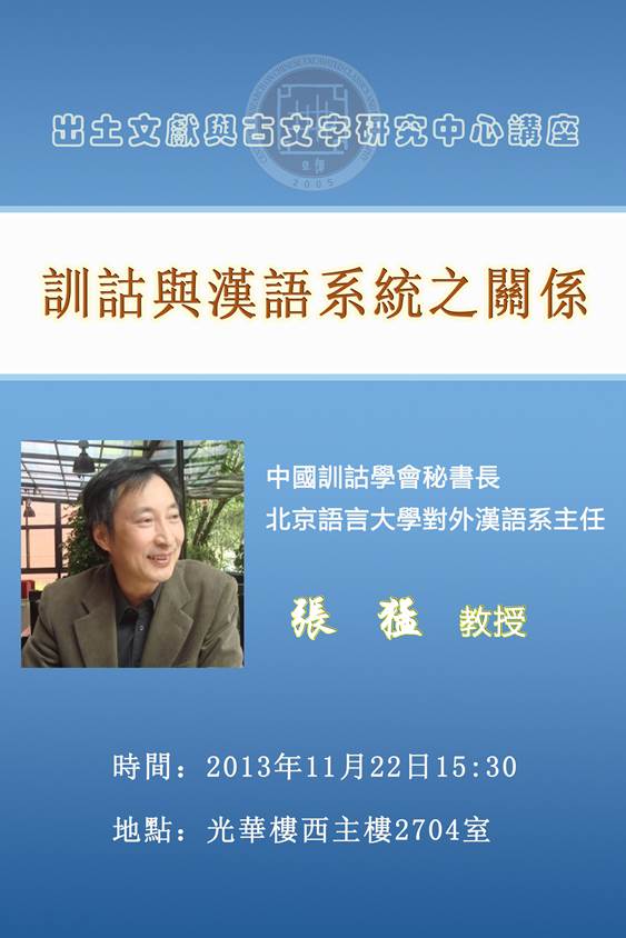 中國訓詁學會秘書長、北京語言大學對外漢語系主任張猛教授將於11月22日下午在我中心作題為“訓詁與漢語系統(tǒng)之關係”的學術講座。
