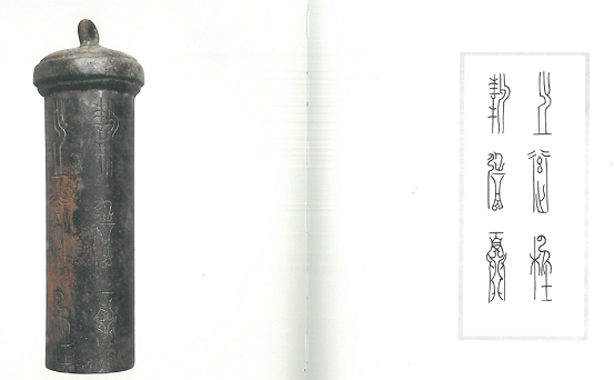 銅柲冒,圓筒形,圓頂,頂上有紐,素面無紋,冒身刻有2行6字: