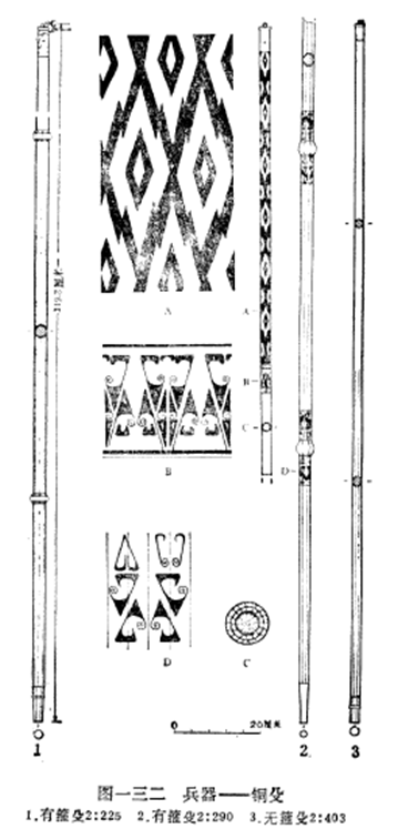 銅質(zhì)帽、鐏,積竹柲。首端套一圓形銅帽,帽上端飾凸棱一周,頂端凸出一圓紐。積竹柲前端截面圓形,後段截面八棱形,外髹黑漆。尾端套一八棱銅鐏,鐏上部飾凸棱一周。通長(zhǎng)163、帽長(zhǎng)5.8、鐏長(zhǎng)4.4釐米。[9]