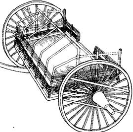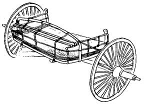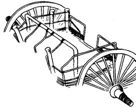 湖北宜城出土戰(zhàn)國(guó)4號(hào)車(下為復(fù)原示意圖),輿長(zhǎng)145、寬114、高65厘米。欄由立柱、軹、轛等構(gòu)成,前部有軾,后端有輦。軫上有圓柱形立柱15根。前軫上7根,用繩綁于軫木外側(cè),直徑2、間距21-23厘米。其中間5根上端折成133度角與軾相接,垂直部分高40、傾斜部分長(zhǎng)56厘米;兩側(cè)角柱相同,上端折成120度角與軾柱相接后,呈水平延伸到后角柱而成為較,較分別與兩側(cè)的輢柱和后角柱相連,垂直部分高47、較復(fù)原后長(zhǎng)63厘米。兩側(cè)軫木上的輢柱對(duì)稱相同,各3根,前一根位于軫上,高21、徑2厘米;中間為橫軾作90度下彎而形成的軾柱,位于軫外側(cè),高80、徑4厘米。后一根位于軫內(nèi)側(cè),高80、徑2厘米。……橫軾兩端折為軾柱,長(zhǎng)155厘米,斷面圓形,徑4厘米(湖北省文物考古研究所等1993)。