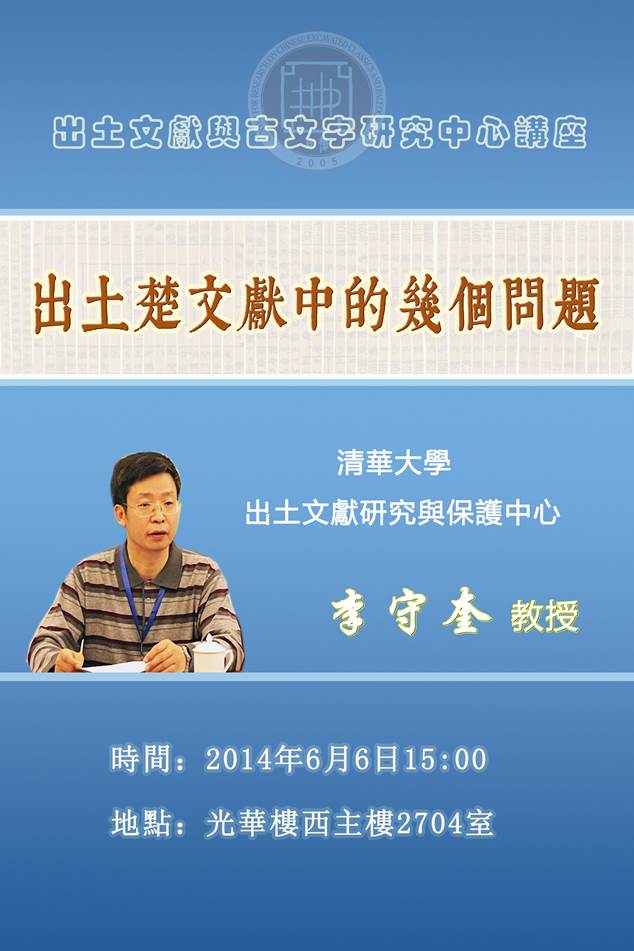 清華大學(xué)出土文獻研究與保護中心李守奎教授將於2014年6月6日下午在我中心作題為“出土楚文獻中的幾個問題”的學(xué)術(shù)講座。