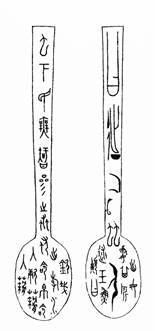 二十世紀(jì)二十年代山西渾源出土的所謂“魚(yú)鼎匕”,是春秋末期趙襄子所滅的代國(guó)遺物,原藏羅振玉,現(xiàn)藏遼寧省博物館。殘長(zhǎng)18.87釐米。匕頭作橢圓形,淺弧形內(nèi)凹,長(zhǎng)柄扁平,柄與匕頭連接處向上斜曲。柄殘斷成三截,中缺一小段。正背面有錯(cuò)金銘文,現(xiàn)存36字。先後著錄於《貞松堂集古遺文》、《貞松堂吉金圖》、《三代吉金文存》、《小校經(jīng)閣金文》、《金文總集》、《殷周金文集成》和《商周青銅器銘文暨圖像集成》。先後有王國(guó)維[1]、李零[2]、詹斳鑫[3]、臧克和[4]、董蓮池[5]等先生考釋。各有發(fā)明。