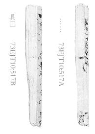 經(jīng)此改訂后,圖版方向正確,釋文也分別與之對應了。但我們發(fā)現(xiàn),該簡A、B面圖版不能構成對稱圖案。按照常理,不應是一枚簡牘的正反兩面。經(jīng)對二者形狀及木紋等進行分析,結果發(fā)現(xiàn)B並非A的反面,而是從A的右半部分剝析而來的半枚殘簡,二者可以按如下關係予以綴合: