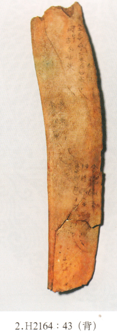 《華夏考古》雜志2014年第4期公布了4件戰(zhàn)國時期韓國的書寫于牛骨上的賬簿。牛骨賬簿1998年出土于新鄭市鄭韓故地H2164灰坑。據蔡全法先生介紹出土的牛肋骨共48根,拼合之后成為45根,最長的有29.4厘米最短的僅6.4厘米,其中39根多少寫有文字。[1]從公布的照片來看,文字殘損嚴重,很多地方僅能看見零星的小黑點。