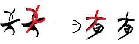 ”形,且左側(cè)弧筆往往偏下。兩個弧筆挨得較近時(相切),很接近兩筆交的形狀(這實際上也是今人寫X時的兩種方法),但個別字形有分得很開的形狀。[2]清華簡出現(xiàn)的兩個“彝”字,其頭部就採用了兩弧筆相切的寫法: