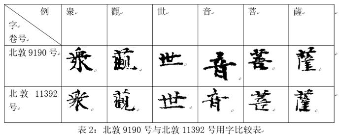 按:《國(guó)圖》已指出北敦8801號(hào)+北敦8789號(hào)+北敦8807號(hào),今謂北敦9190號(hào)、北敦11392號(hào)、俄敦2630號(hào)亦可與此三號(hào)綴合。綴合后如圖3-1、3-2所示,北敦9190號(hào)與北敦11392號(hào)之間僅可遙綴,比勘《大正藏》完整經(jīng)文,依行約13字行款,其間大約缺18行。二號(hào)字跡似同(比較二號(hào)皆有的“衆(zhòng)”“觀”“世”“音”“菩”“薩”字,參表2),可資比勘。北敦11392號(hào)尾2行與北敦8801號(hào)首2行左右相接,銜接處分屬二號(hào)的殘字從右而左、自上而下復(fù)合為“使得”“常念恭”五字,其中“?!弊秩月杂袣垞p,余皆可成完璧。北敦8807號(hào)末行與俄敦2630號(hào)首行左右銜接,原本分屬二號(hào)的“妙音觀世音梵”六字復(fù)合為一,諸字皆有殘損。又該四號(hào)內(nèi)容分別左右相續(xù),北敦11392號(hào)倒數(shù)第2行底端與北敦8801號(hào)首行底端拼合而成的“使得”,與北敦11392號(hào)末行頂端的“離欲”合成完整的“使得離欲”[6]句,文意貫通。北敦8807號(hào)末行底端的偈頌“