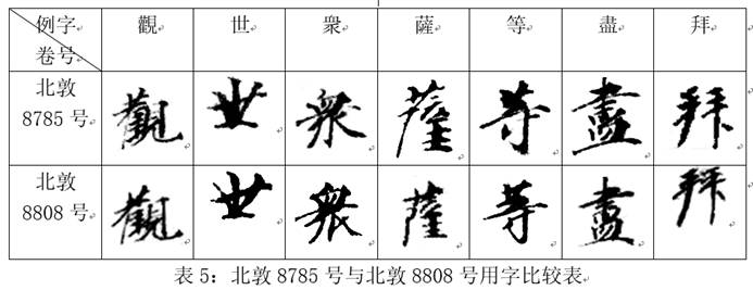 (薩)”與后者首行頂端的“名號(hào)”相連成句,文意完整。且二號(hào)行款相同(半葉5行,行約7字,行間距相等、字間距及字體大小相近),書(shū)風(fēng)相似,字跡似同(比較二號(hào)皆有的“男”“觀”“是”“等”“稱”“解”“壞”“菩”“薩”字,參表4)。據(jù)此判斷,此二號(hào)確為同一寫(xiě)本之脫落,可綴合為一。將俄敦5752V號(hào)2、俄敦5752號(hào)正面與此二號(hào)綴合后,所存內(nèi)容起“稱觀世音菩薩□(名)者”,訖尾題“佛說(shuō)觀音經(jīng)一卷”。相應(yīng)文字參見(jiàn)《大正藏》T9/56C16-58B7。
