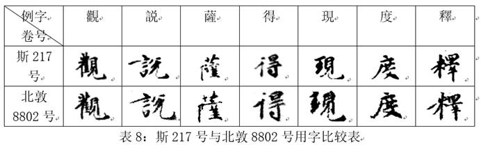 按:《國(guó)圖》已指出北敦8800號(hào)+北敦8803號(hào)+北敦8792號(hào)+北敦8799號(hào)+北敦8813號(hào)+北敦9138號(hào)+北敦9137號(hào)+北敦8814號(hào)+北敦8809號(hào),今謂北敦10992號(hào)亦可與此九號(hào)綴合。綴合后如圖2所示,北敦10992號(hào)背面末行底端的“入”與北敦8800號(hào)正面首行頂端的“于大?!毕噙B成句,文意完整。又二號(hào)均為梵夾裝,北敦10992號(hào)正面右上有序號(hào)勘記“一”字,而北敦8800號(hào)正面右上有序號(hào)勘記“二”,正說(shuō)明此二號(hào)前后銜接,另外七號(hào)梵夾裝寫(xiě)本上亦存有序號(hào)勘記“四”至“十”,可資比勘。且二號(hào)行款相同(半葉5-6行、行約17字、楷書(shū)、行間距相等、字間距及字體大小相近),書(shū)風(fēng)相似,字跡似同(比較二號(hào)皆有的“觀”“解”“薩”“得”“稱”“世”字,參表1),據(jù)此判斷,此二號(hào)確屬同一寫(xiě)本之脫落,可綴合為一。十號(hào)綴合后,所存內(nèi)容起首題“妙法蓮華經(jīng)觀世音菩薩普門(mén)品第廿五”,訖“尋聲自回去”。相應(yīng)文字參見(jiàn)《大正藏》T9/56C2-58A9。