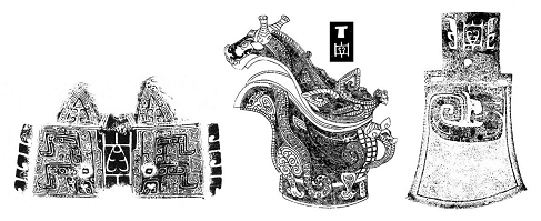 ”鉞(殷周11725,商周18207)弧刃,束腰,長方形內,闌側兩穿,內上有一圓孔,兩面飾顧首夔龍紋,內上鑄“