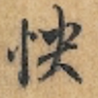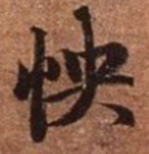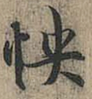 晉王羲之《蘭亭集序》有“快然自足”一語。其中“快”字,在現(xiàn)存蘭亭臨摹本中基本作“怏”。蘭亭八柱第二本(世稱褚遂良摹本)作“快”,但其字形明顯有折中“快”與“怏”的痕跡,可推知其所臨原本為“怏”。但是,自《晉書》至《古文觀止》的各種史傳文集,均將該語錄作“快然自足”。作“怏”的書法碑帖和作“快”的詩(shī)文典籍的兩大體系長(zhǎng)期并行。潁上本蘭亭刻帖(又名“思古齋本”)在“怏”字旁注一“快”字,可以代表當(dāng)時(shí)取“怏”之形而取“快”之義的調(diào)和態(tài)度。[1]