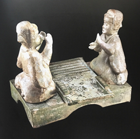 2017年3月,中國(guó)國(guó)家博物館聯(lián)合大英博物館主辦了主題為“大英博物館100件文物中的世界史(A history of the World in 100 Objects)”的展覽,并出版了相關(guān)圖錄。此次展覽展出了多件源自中國(guó)的文物,尤其是序號(hào)為033的展品“六博俑(Modle of Liubo Players)”,引起了筆者的興趣,現(xiàn)附圖片如下(圖一)[1],以便討論。