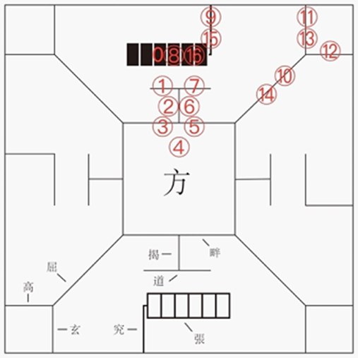 據(jù)六博行棋步數(shù)表(表一)可見(jiàn),十八面骰子能擲出的最大數(shù)字“十六”,與走完許博昌口訣“張道揭畔方”等句的步數(shù),是一致的;據(jù)六博行棋示意圖(圖十)可見(jiàn),自“張”位開(kāi)始行棋,按照許博昌口訣的順序,經(jīng)過(guò)16步,棋子最后又會(huì)回到“張”位。若六博俑上棋子所在的初始棋位確為“張”位,則兩套六博俑、許博昌口訣、十八面骰子與尹灣漢墓《博局占》上所提供的六博信息,就得到了完美統(tǒng)一。因而得以證明,六博的初始棋位,就是大英六博俑與河南六博俑在博局上所表現(xiàn)的“張”位,那么六博棋子的初始排列順序,也應(yīng)當(dāng)如六博俑上所表現(xiàn)的,雙方的六顆棋子,并列排布在“張”位上。