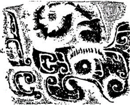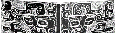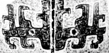 這種紋飾進(jìn)一步演變,就變成下面兩圖這種樣子。有兩個(gè)身子,一左一右,尾巴卷起來(lái)。圖案下方有比早期清楚的爪子。背上的立刀省成一個(gè)。下圖第一個(gè)是殷墟早期的。第二個(gè)也是殷墟早期的,它是獸面紋,兩個(gè)腳,尾巴很短,上面的立刀形還存在。