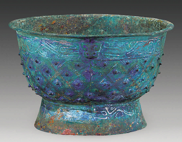西泠印社二零一七年秋季拍賣會中國歷代青銅器專場中有一件珍貴的拍品德師盂,圖錄編號為615,通高16.4釐米,系民國時期駐華大使司徒雷登(John Leighton Stuart)舊藏?!端就嚼椎桥f物-青銅德師盂小析》對這件銅器進行了初步的研究,青銅盂平唇口沿,深腹,近底內(nèi)斂,下有高圈足外撇。頸部有高浮雕龍首,雙角折捲,占整個頭部一半。兩目呈“臣”字形,嘴部簡化。以龍首為中心,對稱分佈浮雕爬行龍紋,頭部相對,上頂尖角,下有一小足。背部躬起,尾部岔分兩向,其一前勾捲曲,另一蜿蜒至地復又內(nèi)捲。腹部裝飾百乳雷紋,亦稱斜方格雷乳紋,鼎、簋和罍的腹部常以之為主要紋飾。圖案呈斜方格,每一格邊緣作雲(yún)雷紋,中間有一乳突。百乳雷紋盛行於商代中期、晚期直到西周早期。商代的乳突圓潤平坦,西周的則長而尖銳。高圈足上裝飾三組對稱的爬行龍紋,造型與頸部相同,只是沒有高浮雕龍首。盂紋飾較淺,顯然經(jīng)歷了大範圍的除鏽,器身變得纖薄。光亮的皮殼,當是燙蠟所致。容庚在《商周彝器通考》中記載:“乾嘉以前出土之器,磨礱光澤,外敷以蠟?!贝朔墒骨嚆~器更好地保存,流程即將古銅器先行清洗,用酸梅膏糊清除銅銹,後用獸皮打磨表面,拋光以後塗臘保護。而盂的底部,保留了原始的銹色,層次豐富,沁沒入骨。這種部分清理的現(xiàn)象,見於晚清民國時期[1]。