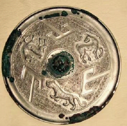 下面我們附帶談一下與“山”字紋飾有關(guān)係的青銅鏡,戰(zhàn)國(guó)時(shí)期的楚國(guó)流行一種山字紋飾的鏡,根據(jù)山字的數(shù)目,可以分為三山鏡、四山鏡、五山鏡、六山鏡?!短倩ㄍょR譜》、《小檀欒室鏡影》稱(chēng)為山字鏡,梅原末治稱(chēng)為丁字鏡,有的歐美學(xué)者稱(chēng)為“T”字鏡[7]。這種鏡子上的主體紋飾到底是不是“山”,《上海博物館藏青銅鏡》17著錄有一件四山四鹿紋鏡,鏡背飾四山字形紋,其間有四幼鹿。瑞典遠(yuǎn)東博物館藏有一件四山一犬三鹿紋鏡,另藏有一件三山一犬二路鹿鏡,李學(xué)勤先生認(rèn)為這些山字形銅鏡所飾的動(dòng)物都表示的狩獵的含義,狩獵成為當(dāng)時(shí)鏡子上的紋飾主體,已有洛陽(yáng)金的錯(cuò)金銀鬥獸紋鏡等例證[8]。狩獵動(dòng)物圖像同“山”字紋結(jié)合,就證明這種紋飾確實(shí)表示的是“山”。