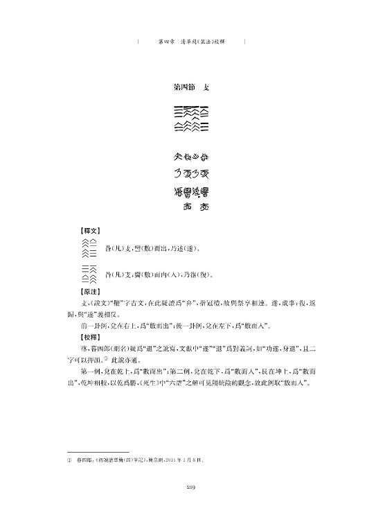 2015年,王化平、周燕先生著有《萬物皆有數(shù):數(shù)字卦與先秦易筮研究》一書,由人民出版社出版,書中除對王先生此前的散篇著述加以整理總結外,重點補充了《筮法》的研究內(nèi)容,這是在拙文草成之時未曾引及的。2017年,丁四新先生著有《周易溯源與早期易學考論》一書,由中國人民大學出版社出版,也是藉助《筮法》等新材料,對相關易學問題進行了深入探討。在此基礎上,丁先生還先后發(fā)表了兩篇重要文章:《數(shù)字卦研究的階段、貢獻及其終結》(《周易研究》2018年第5期)和《數(shù)字卦及其相關概念辨析》(《中國哲學史》2019年第3期)。前者應屬于本書第三章第一節(jié)在數(shù)字卦研究“目前存在的問題及研究前景”中所提到的“數(shù)字卦性質的認識尚未統(tǒng)一,相關名稱概念的使用依舊混亂”的問題,丁先生認為數(shù)字卦研究有其階段性意義,并應逐漸走向終結,這是值得我們進一步思考的。后者曾對我作的研究綜述以及關于數(shù)字卦與卦畫圖形性質的劃分,進行了批評,這是要十分感謝的。也請大家在閱讀本書相關章節(jié)時配合參看。