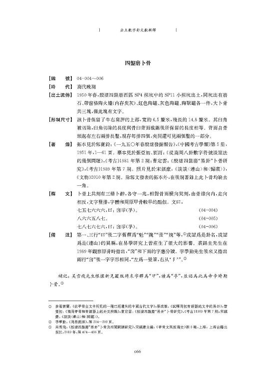 殷墟四盤磨所出數(shù)字卦卜骨(本書04-004至04-006)是第一次科學考古發(fā)現(xiàn)的數(shù)字卦材料,其上所記三行文字在很長時間不被正確釋讀。自張政烺先生破解了數(shù)字卦之謎后,第一、三行末尾二字曾被合釋為“魁”“隗”“畏”“媿”等,或認為是卦名,或認為是《連山》的異稱,在易學研究上曾產(chǎn)生了很大的影響。1989年裘錫圭先生觀察原物時曾指出這兩個字應分讀為“囟(斯)□”,李學勤先生2002年再驗實物后指出,兩“囟”后一字字形相同,“左為一豎筆,右從‘卩’”(《周易溯源》,成都:巴蜀書社,2005年,第204—209頁)。我在讀到這則材料時就懷疑此應釋為“囟