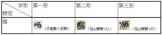 一、今復(fù)考楚系「雁」字,大抵可分作三形,茲復(fù)引其字表要例: