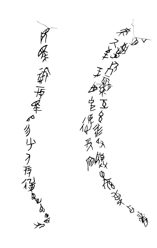 第一行“五”字位于龜甲齒紋斷處,據(jù)殘劃應是“五”字。第二行“來”字上亦為齒縫之折,上面應該殘去一、兩個字。