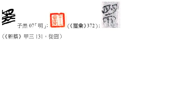 附帶一提,《璽彙》372的「盟」或以為從「目」。不過此字形與《子羔》07的「盟(明)」上部同形。而《子羔》07是由類似《新蔡》甲三131從「囧」的「盟」字演變而來,則《璽彙》372似應(yīng)理解為從「囧」。