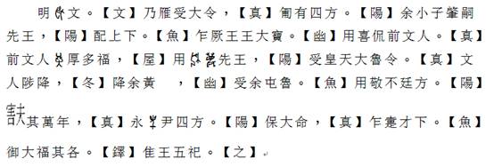 另外一點(diǎn)就是在詩經(jīng)各部分中,〈周頌〉有一個(gè)異於其他部分的顯著特點(diǎn)就是其中很多詩都不入韻,據(jù)王力的擬音,全篇基本上無韻的詩有〈清廟〉、〈維天之命〉、〈昊天有成命〉、〈時(shí)邁〉、〈臣工〉、〈噫嘻〉、〈武〉、〈小毖〉、〈酌〉、〈桓〉、〈般〉等。[9]其中〈昊天有成命〉、〈時(shí)邁〉、〈武〉、〈酌〉、〈桓〉、〈般〉至少其中數(shù)篇極有可能是周初創(chuàng)製的〈大武〉樂章的歌詞。[10]王國(guó)維曾解釋說其詩不入韻是因?yàn)椤粗茼灐档穆曊{(diào)較緩。這個(gè)解釋是不盡人意的。以西周金文與〈周頌〉諸詩比讀,我們發(fā)現(xiàn)西周金文大約也是在共王時(shí)期開始,向韻文方向演變,而且在宣王時(shí)期更是出現(xiàn)了一種普遍入韻的傾向。其中〈周頌〉與金文中某些成語正是在韻文發(fā)展的過程,為了入韻而生成的。比如「永保用享」、「用享用孝」、「萬壽無疆」這一類的成語。