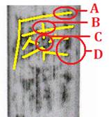 A:“石”旁不應(yīng)只作“廠”形 B:“來”上不應(yīng)作“十”形 C:此處中空,豎筆不連貫 D:右旁多出的筆畫無法解釋 |