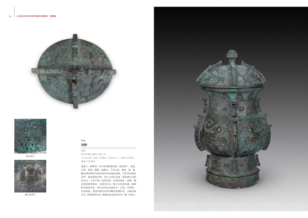山東省文物考古研究院自1981年成立至2021年建院40周年,為慶祝這一時(shí)刻,分享田野考古和文物保護(hù)工作的收獲,特意出版《山東省文物考古研究院藏文物精粹》系列圖錄,本書即其中之一,收錄山東銅器文物中的精品。山東省文物考古研究院藏銅器按時(shí)代可分商代、西周、春秋、戰(zhàn)國、漢代五部分,商代器物主要是青州蘇埠屯出土的;西周器物主要出自高青陳莊、濟(jì)陽劉臺(tái)子、滕州莊里西等;春秋器物較多,主要出自沂水紀(jì)王崮、劉家店子,莒縣大店,滕州薛國故城等;戰(zhàn)國器物的出土地主要有臨淄 東夏莊、張家莊、相家莊,滕州大韓等;所選漢代器物主要出自曲阜九龍山。