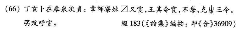 又: 《卷一》第228頁,第16行,“綴183”當(dāng)為“綴185”?!堆a(bǔ)正》表一、表二皆未及。該版甲骨卜辭,裘先生釋為:
